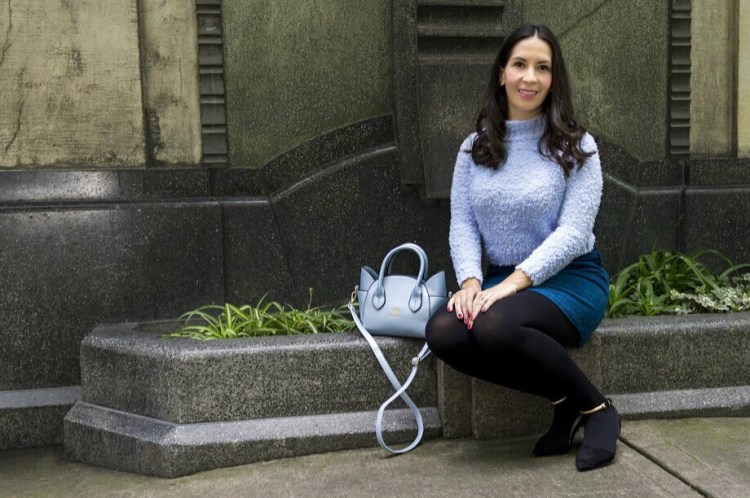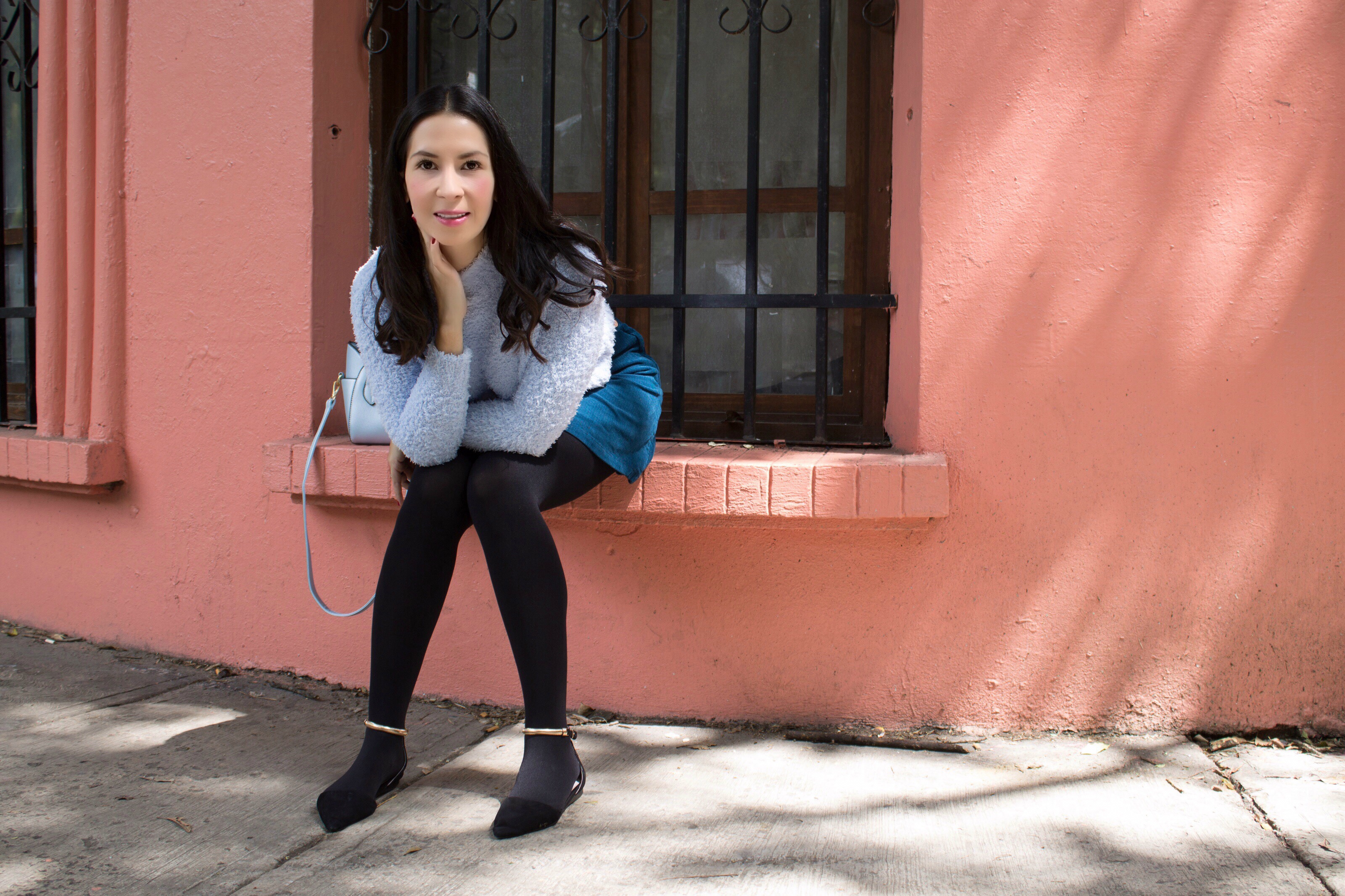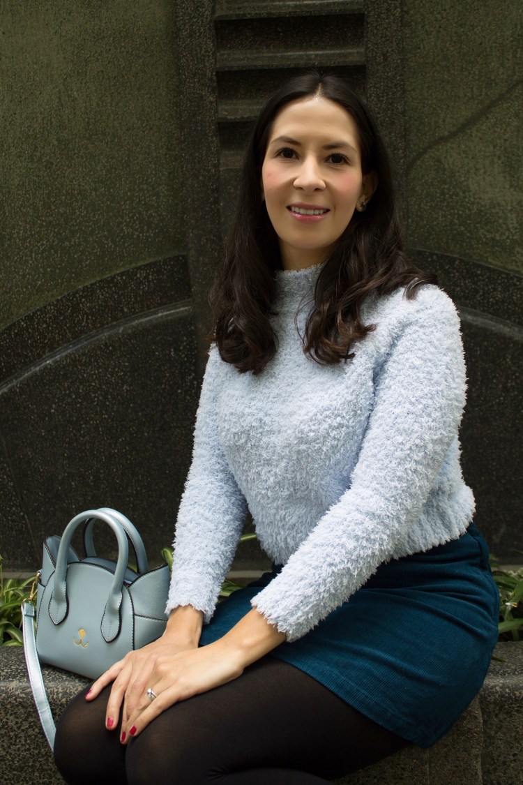 Las minifaldas regresan esta temporada pero con un twist en cuanto texturas: la pana. Una textura que ha regresado una y otra vez, y que es linda y abrigadora para climas fríos. Lo bueno de la mini falda es que puedes usarla en días con más calor o bien con medias para días más fríos como lo hice yo en esta ocasión. Por ser una falda a la cintura la acompañe de un croptop azul pastel súper abrigador y suavecito, la bolsa de gato azul que tanto me gusta y no había tenido oportunidad de usarla en un outfit post y los zapatos que compre en el viaje a Colombia. Lo que más me gusto es que es un outfit muy lindo, femenino, cómodo y versátil porque puedes usarlo para ir al cine, a comer, a trabajar, el fin de semana, en fin!