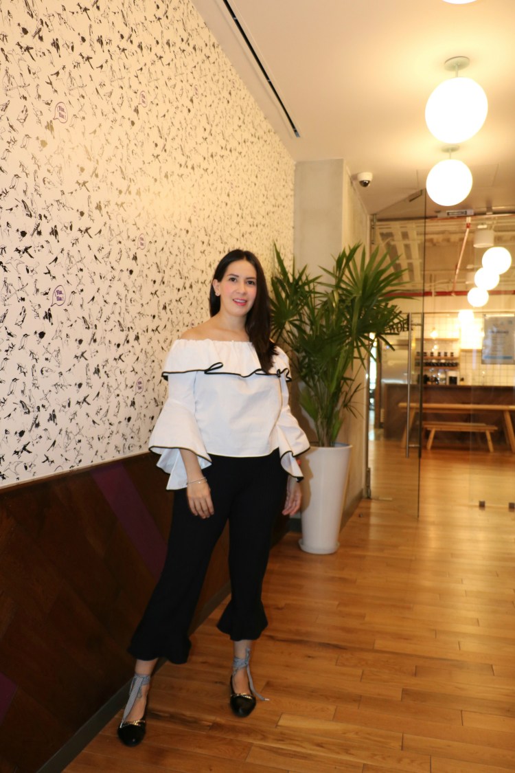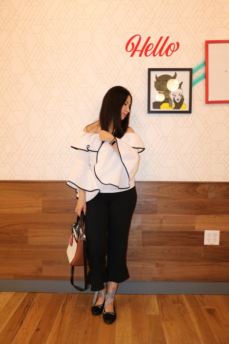 Sobre mi outfit quise probar con black and white y además como les contaba quise usar olanes o volantes en todos lados! El top es muy fresco y combinable para esta época de calor y los pantalones crop me encantan por el olan que tienen porque los hacen muy femeninos y además aún no me quedan mis pantalones así que son una gran y cómoda opción en estos días. Los zapatos tienen esta tendencia de ballerinas con lazos que hacen el look aun más interesante y para agregarle color que tal un bolso divertido con un tag o charm como este de Leonora.