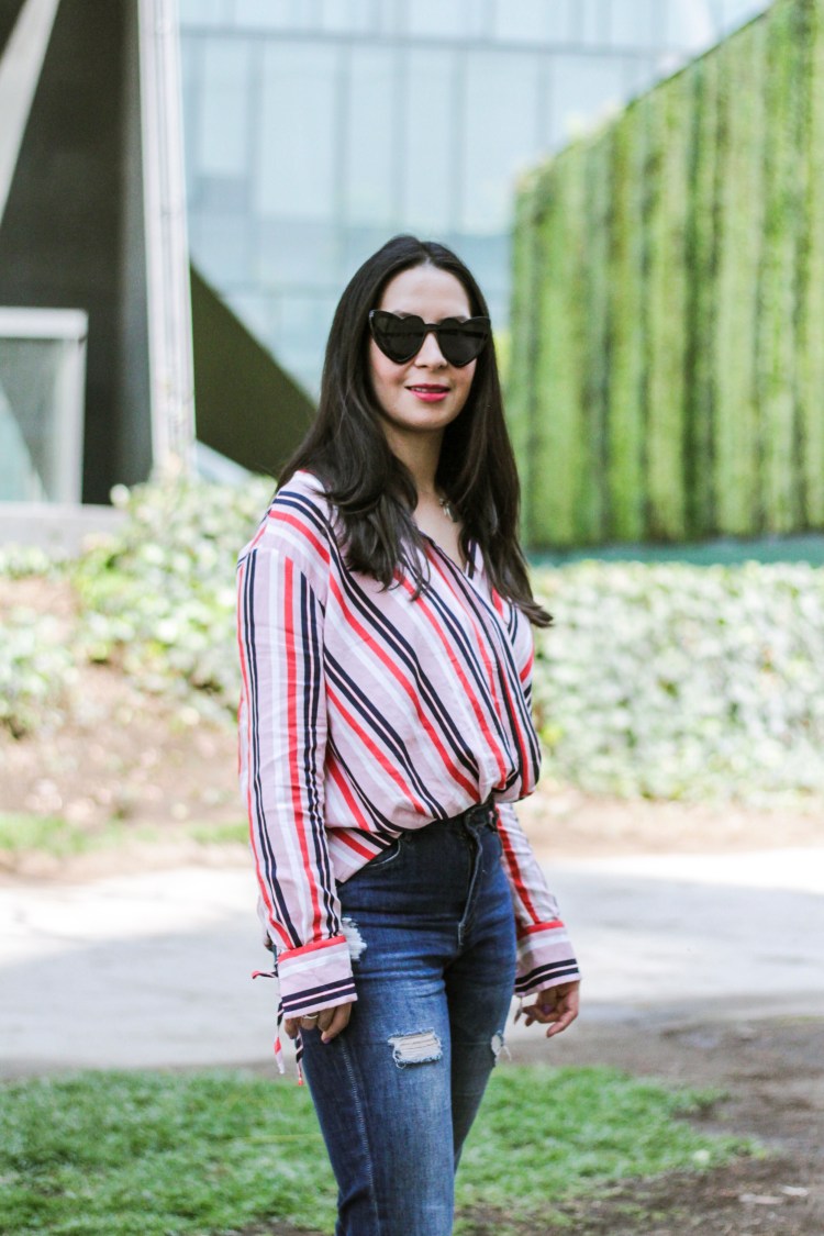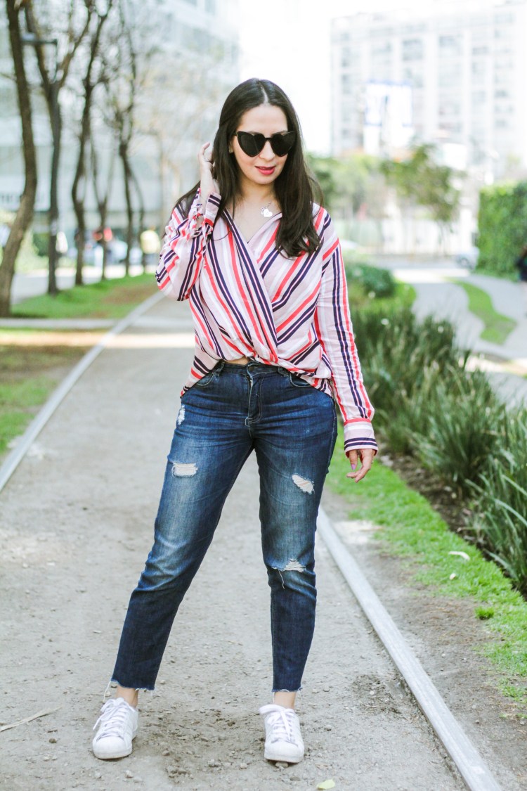 Como les había contado en mi post anterior de tendencias de Primavera, las rayas vienen muchísimo esta temporada y que mejor que usarla para un día casual y normal que con una blusita linda y además rosa. Y siempre había querido hacer este efecto de meterme la blusa por enfrente y nunca lo había logrado con estilo jajaja, así que cuando encontré esta blusa que ya viene así en Bershka la ame!! La combine con jeans rotos y tenis para estar aún más cómoda y además darle ese toque cool al outfit, junto con el bolso divertido y grande, ¿les gusta?