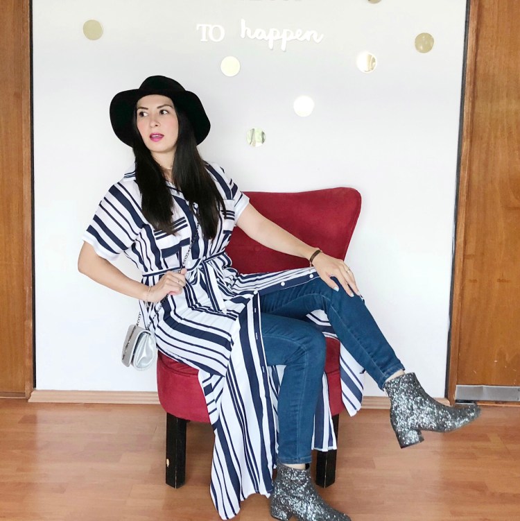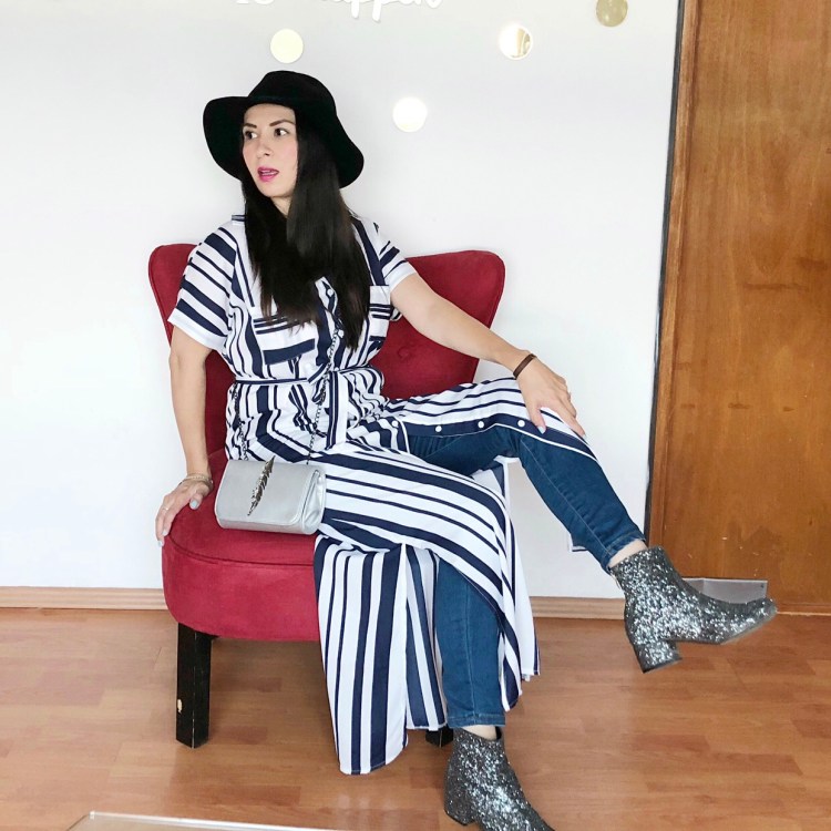 Pero para esos días en que llueve y el clima cambia drásticamente, decidí usar mi vestido largo de rayas con jeans, botines con glitter y un sombrero negro para controlar el frizz, ya saben.Sombrero: Banana Republic, bolso: igual que el vestido entren a https://www.bestalook.com/p/15034, botines: Capa de Ozono, old