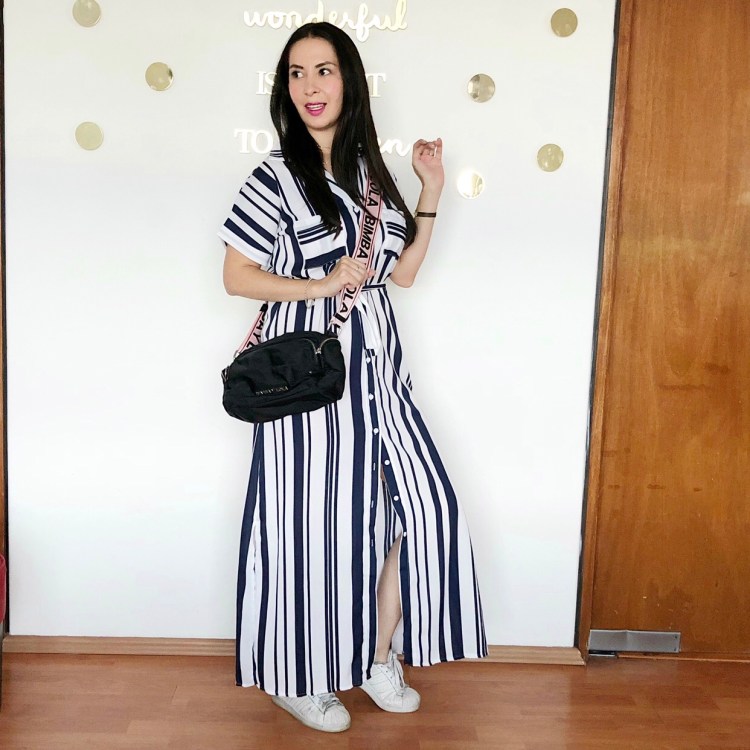 Pensando en un día que quieras verte linda y chic pero tengas que caminar mucho, lo mejor es combinar el vestido largo de rayas con tenis blancos y un bolso más sporty.Tenis Adidas, bolso Bimba y Lola.Outfit 4. Sporty chic for a day where I have to walk a lot, there is nothing better than white sneakers and a cute sporty like handbag.