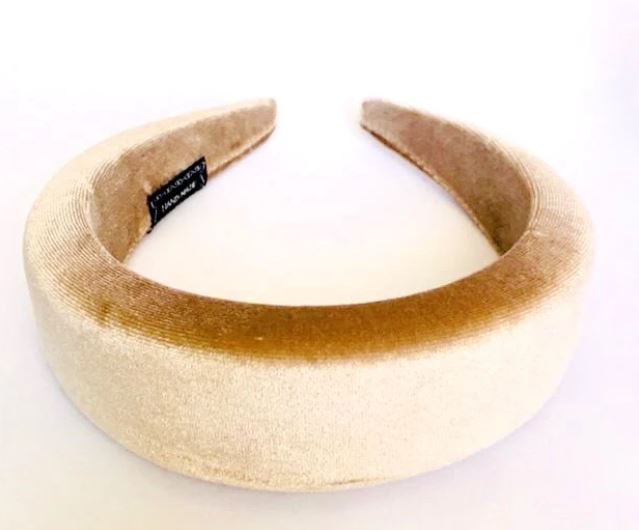 Diadema acolchada en terciopelo color champagne: las diademas de terciopelo también son un must esta temporada y este color me pareció muy combinable. Maria Clara accesorios, compra aquí.