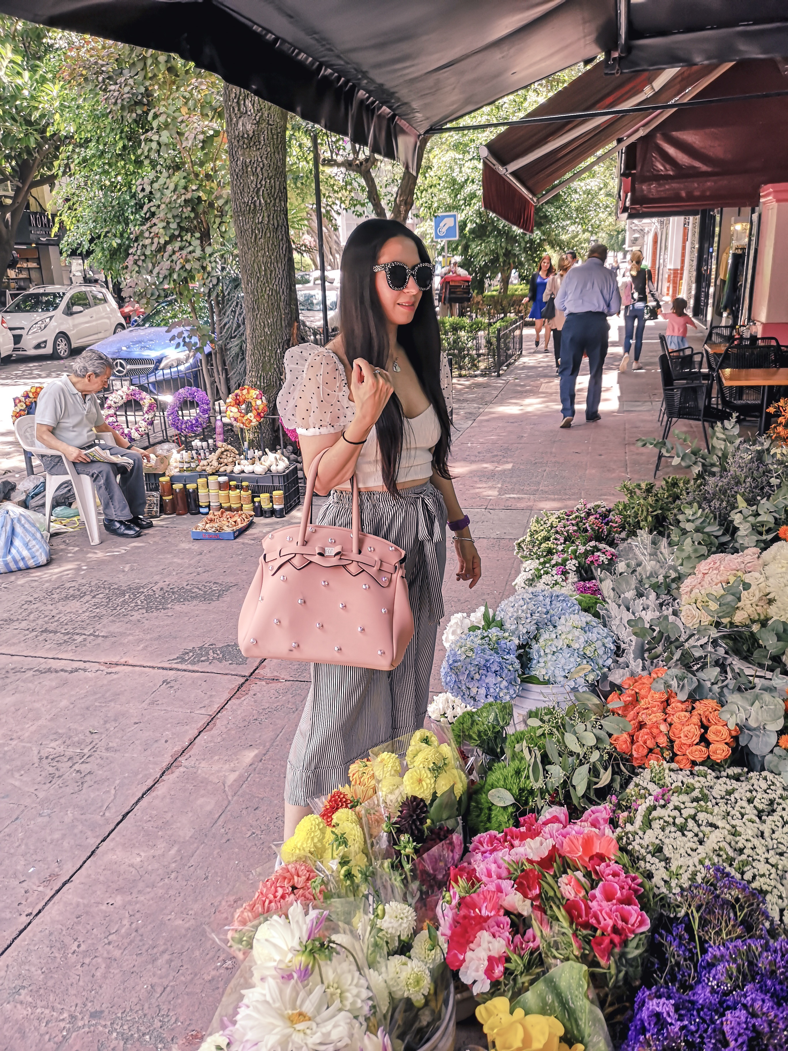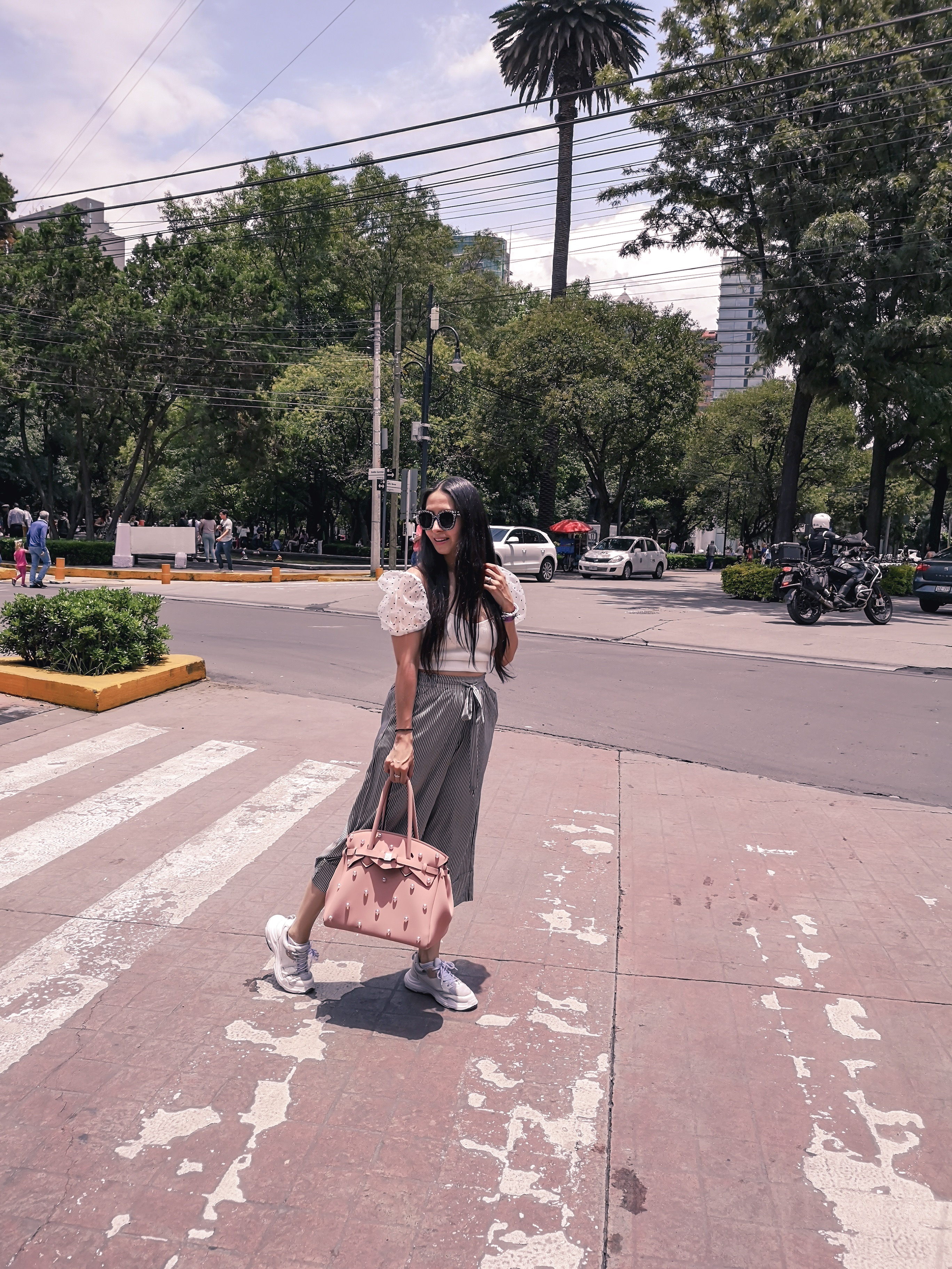 Para crear este outfit cool de fin de semana tuve un pequeño inconveniente y es que la blusa de pronto no es tan cómoda, sobretodo si como yo tienes que correr y cargar a un bebé, pero decidí compensar su comodidad con unos pantalones blancos con rayas grises y mis tenis chunky mega cómodos y un bolso que le cabe todo, que es rosa pastel y que parece que tiene burbujas!. Y al final funcionó perfecto porque logré correr detrás de bebé bombón, desayunar en familia y todo lo que hace en una mañana de fin de semana.