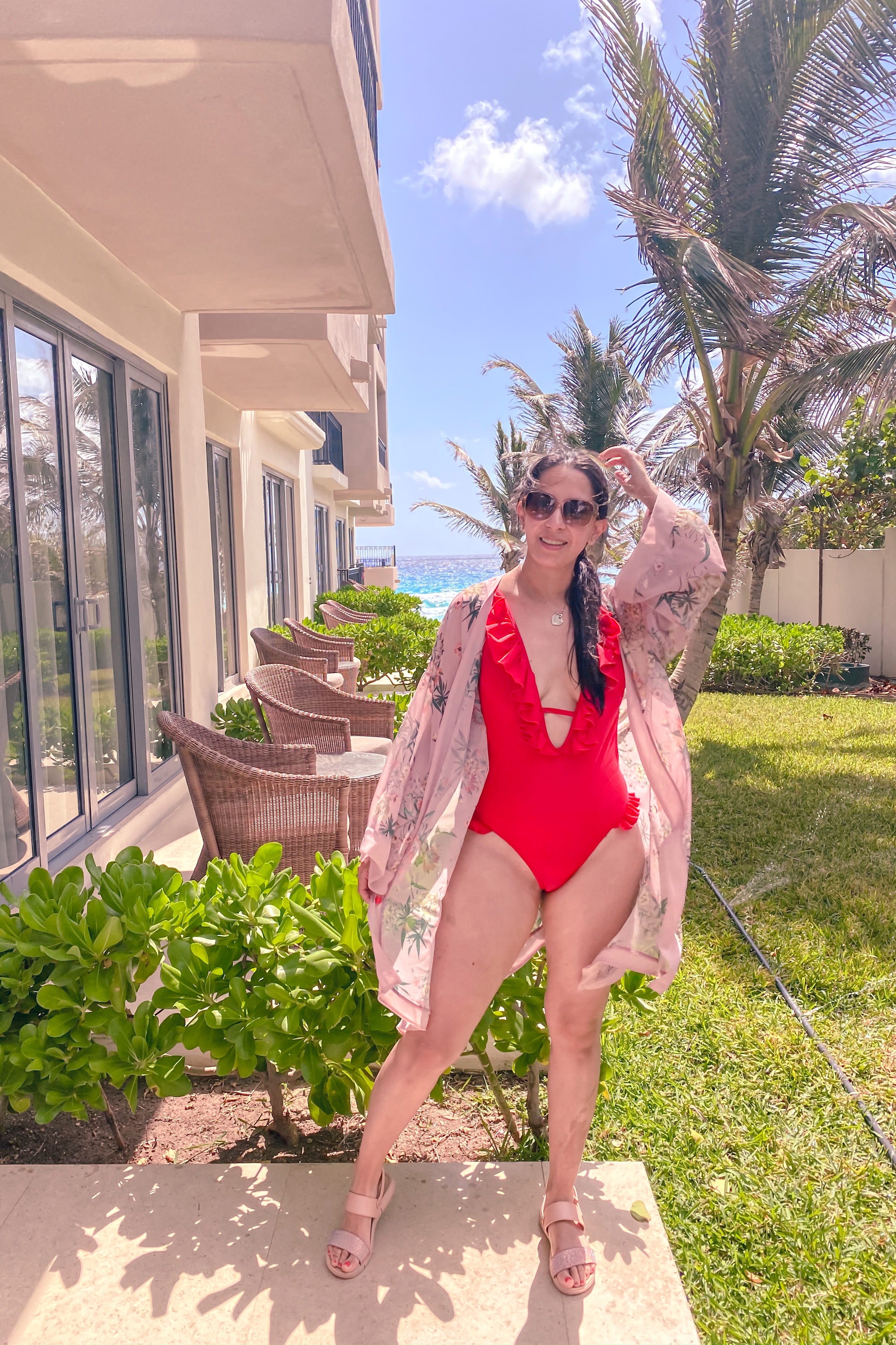 Elegí 3 modelos en SheIn: un tankini verde con un top con flores, un traje completo floral con la parte de arriba rosa y un escote lindo, y un traje rojo muy sexy y más escotado de lo que estoy acostumbrada, pero muy bonito y favorecedor.