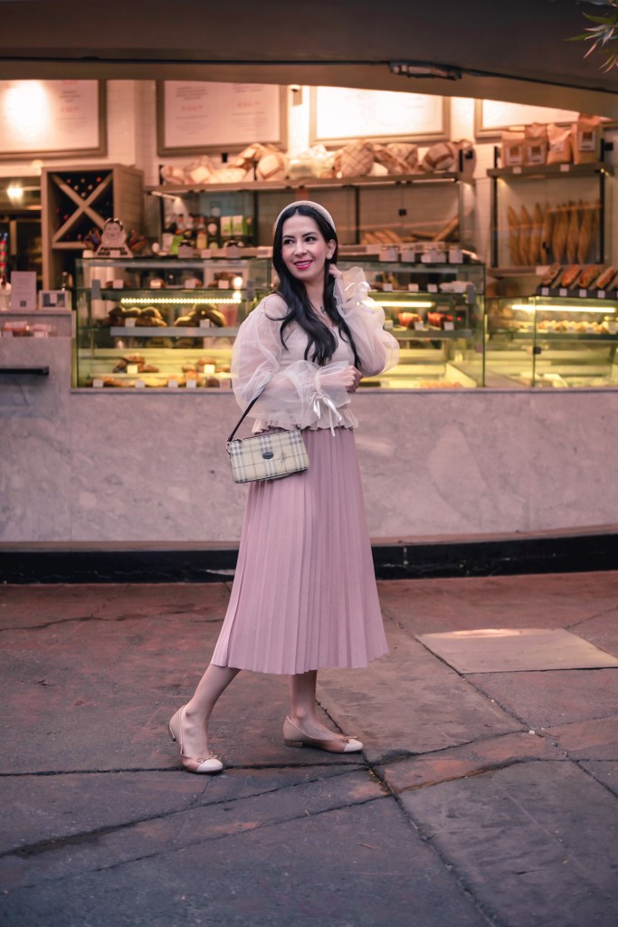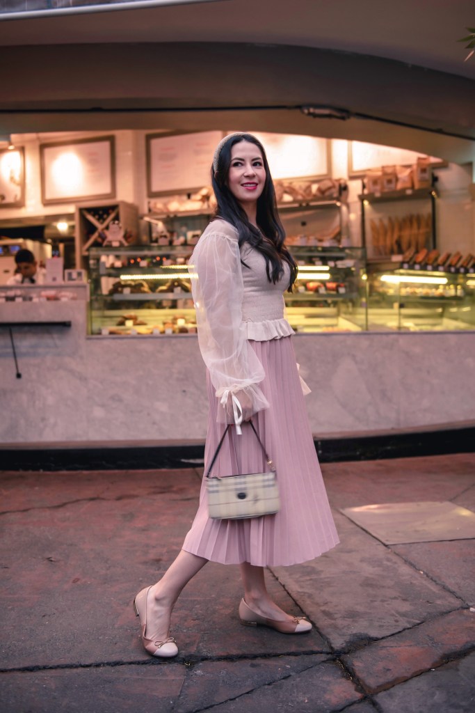 El resto del outfit es una falda midi rosa pastel con un ligero brillo también de SheIn, unas ballerinas o flats color camel con la punta blanca que son acolchadas y lindas de Modare Ultracomforto, un bolso vintage Burberry que tengo desde hace mil años (una tendencia de la que pronto les contaré más) y mi diadema acolchada de terciopelo rosa de Clara Accesorios.