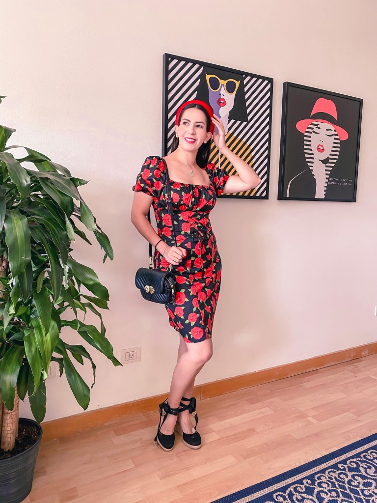 El vestido rojo me parece un poco más sexy por el corte más pegadito y el detalle de la agujeta, yo lo combiné con unas plataformas de cuña con lazos negros y una diadema acolchada de terciopelo roja. Encuéntralo aquí