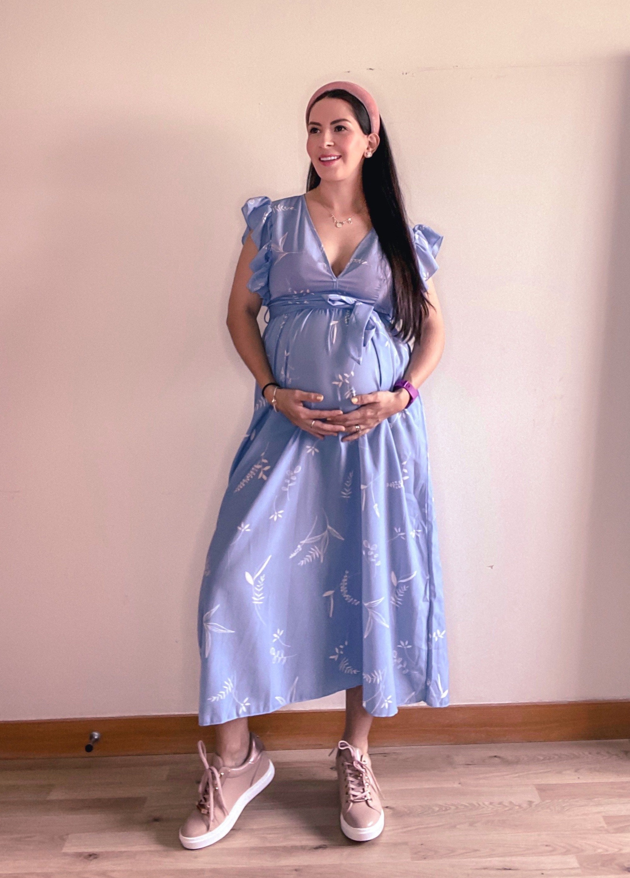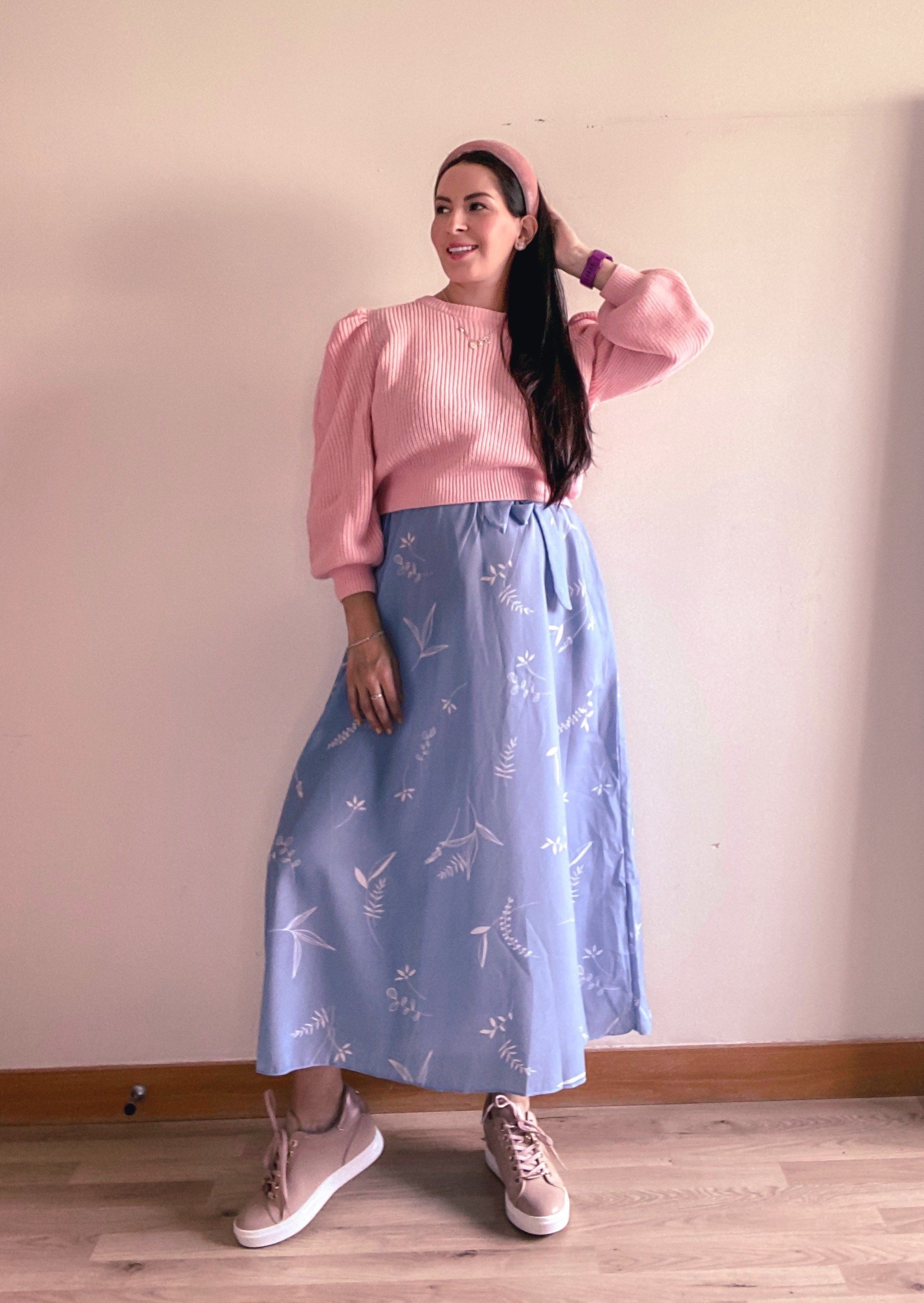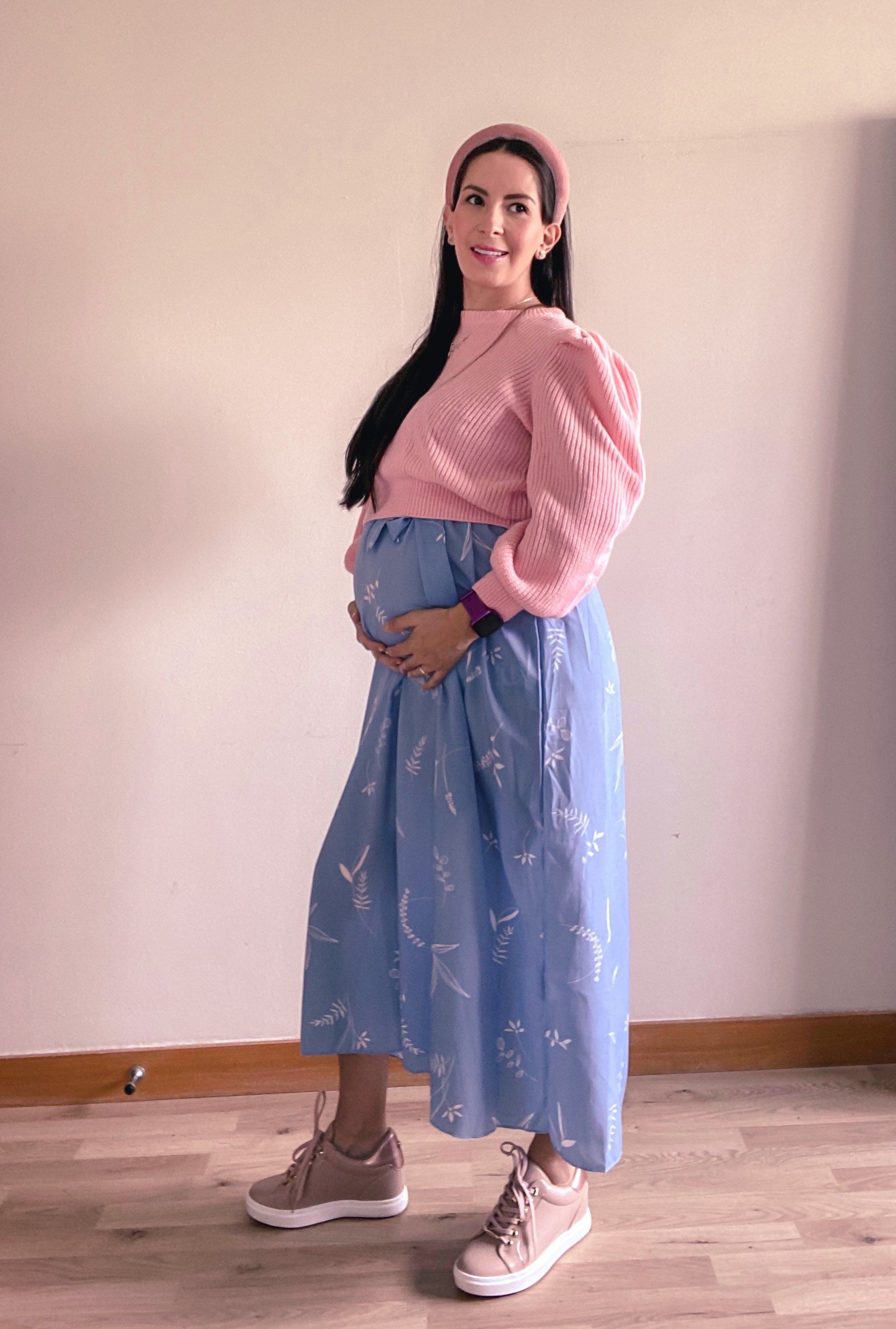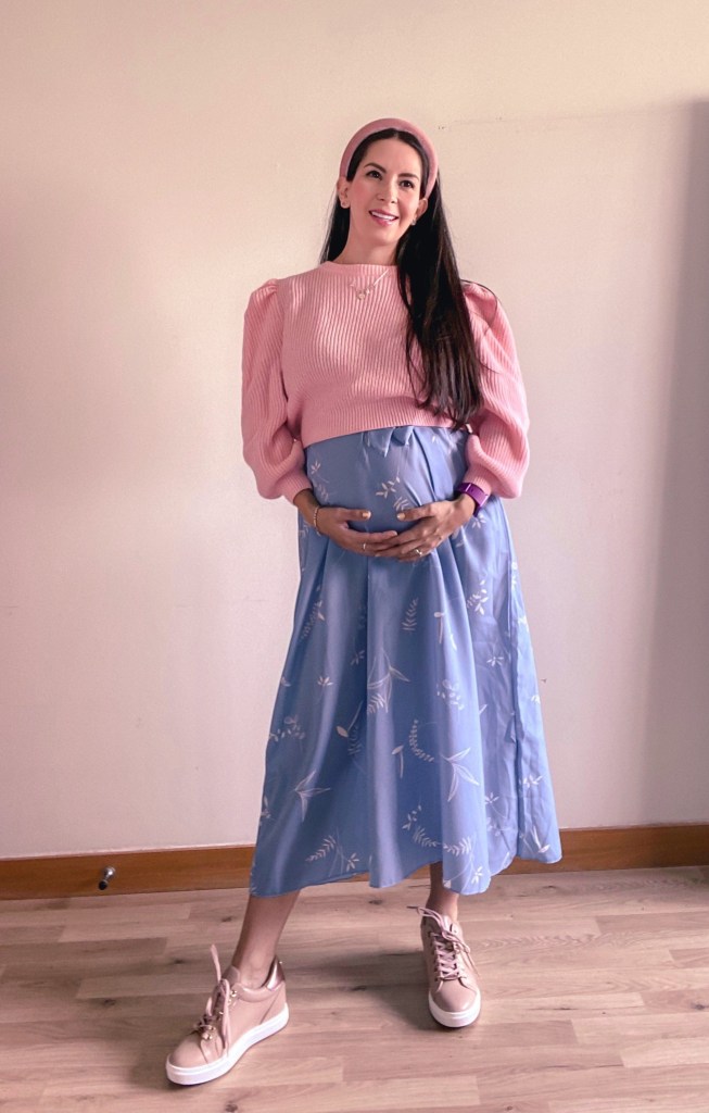 Yo probé esta tendencia con mi vestido azul largo que tiene unas mangas preciosas de SheIn que me encanta y lo he utilizado mucho en estos días porque además mi baby bump de 6 meses todavía entra, pero la semana pasada tuvimos unos días fríos y entonces intenté combinarlo con mi suéter cropped rosa pensando que tal vez me vería como Winnie the Pooh, pero me encantó el resultado. Usé mi vestido y suéter rosa con mis tenis rosas que encontré en Westies en oferta y no saben lo cómodos, suavecitos y combinables que son.