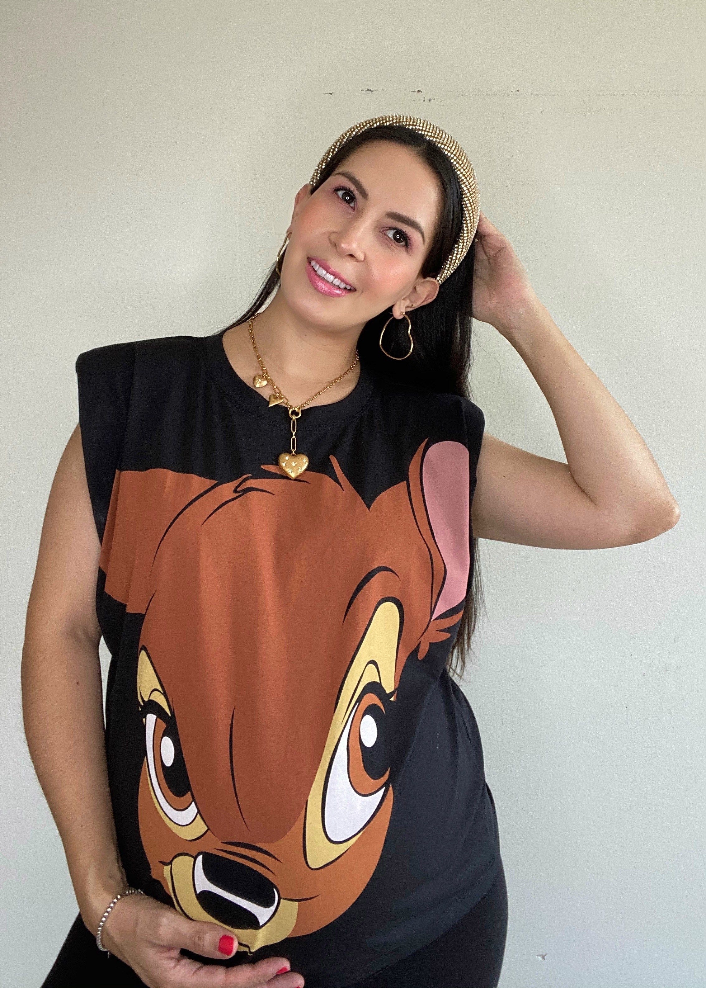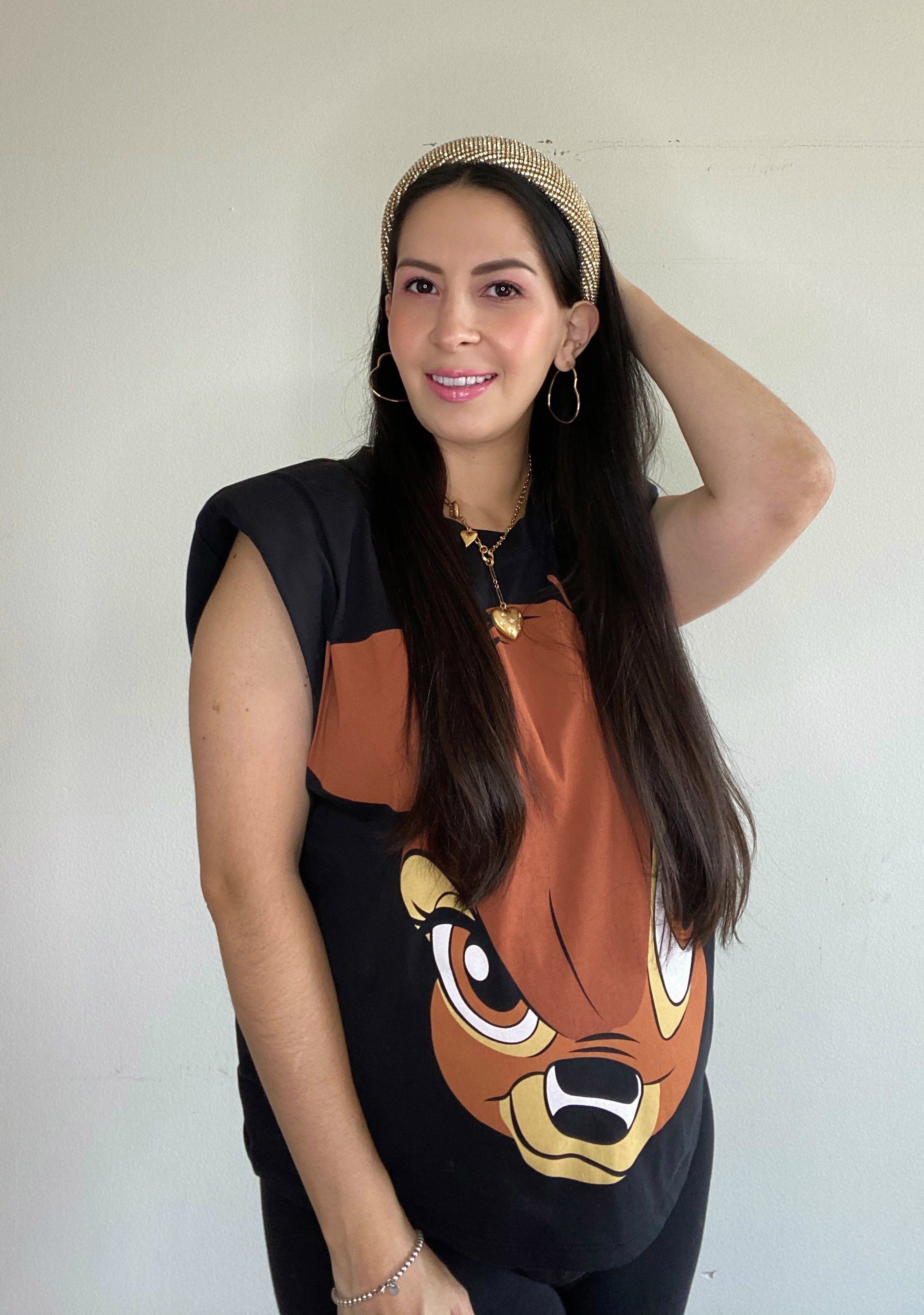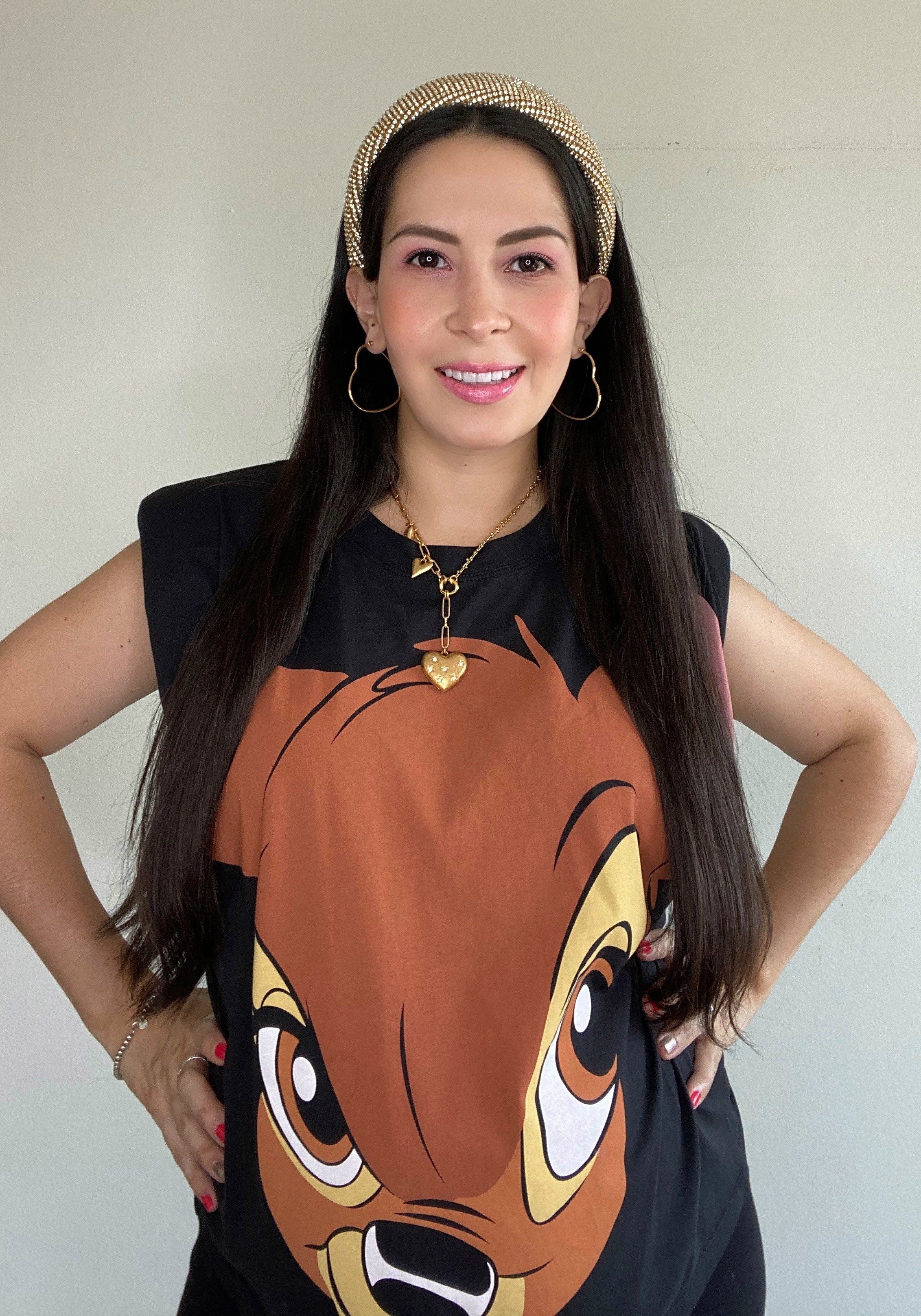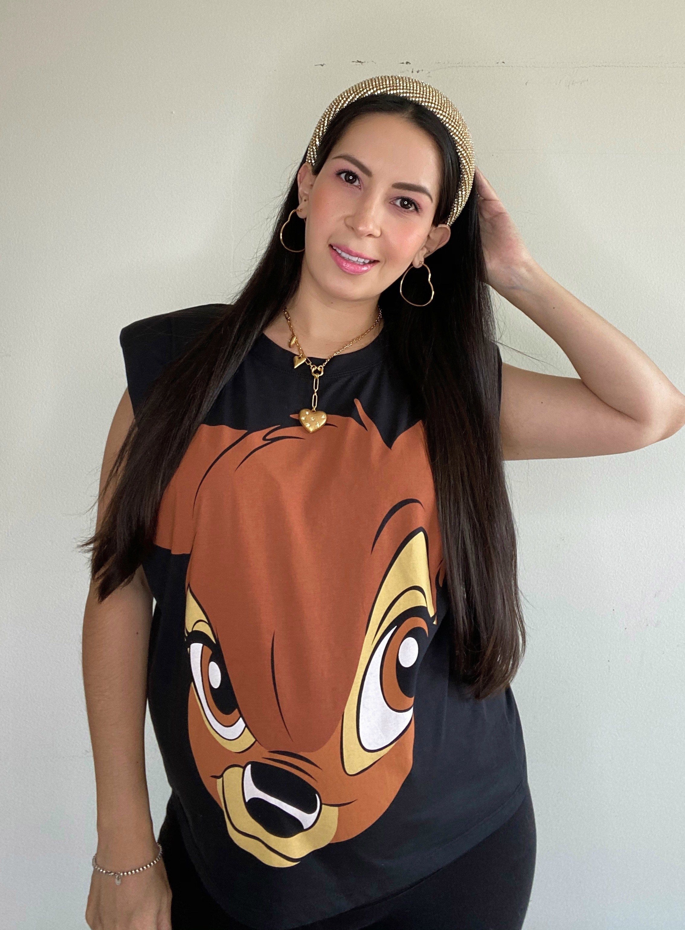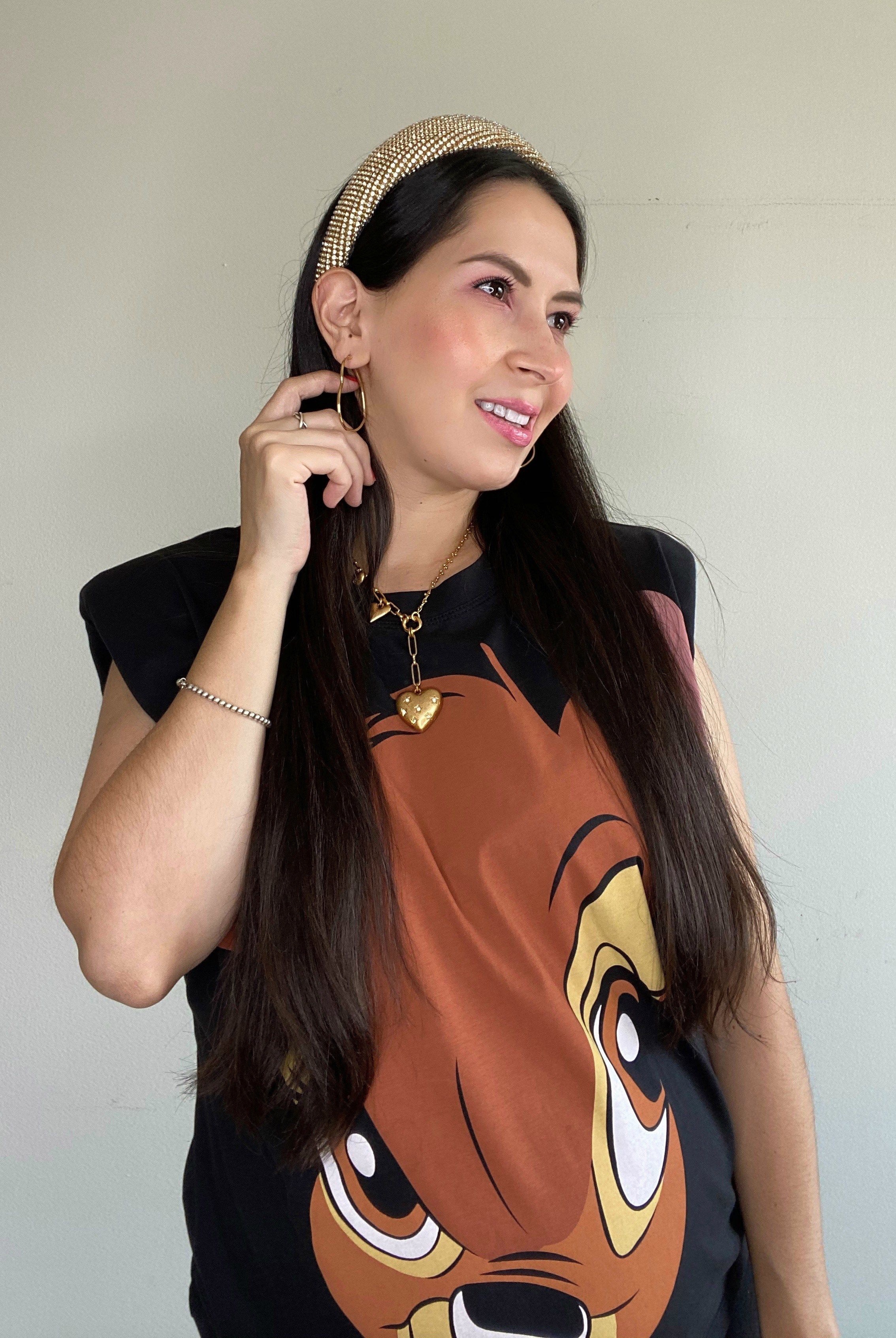 De hecho estoy como niña en tienda de dulces, viendo los adelantos de temporada Otoño en los web sites de mis tiendas favoritas. Ya les había contando un poco de cuáles eran las tendencias que venían y podíamos probar desde ya, y caí en la tentación de comprarme una T-shirt sin mangas y con hombreras, que está súper en tendencia, pero cómo estampado de Bambi y un collar de cadena dorado con corazones que viene muchísimo, y decidí probarlos juntos con mas accesorios en dorado para darle un respiro a los vestidos florales y boho, y darle la bienvenida al pre fall.