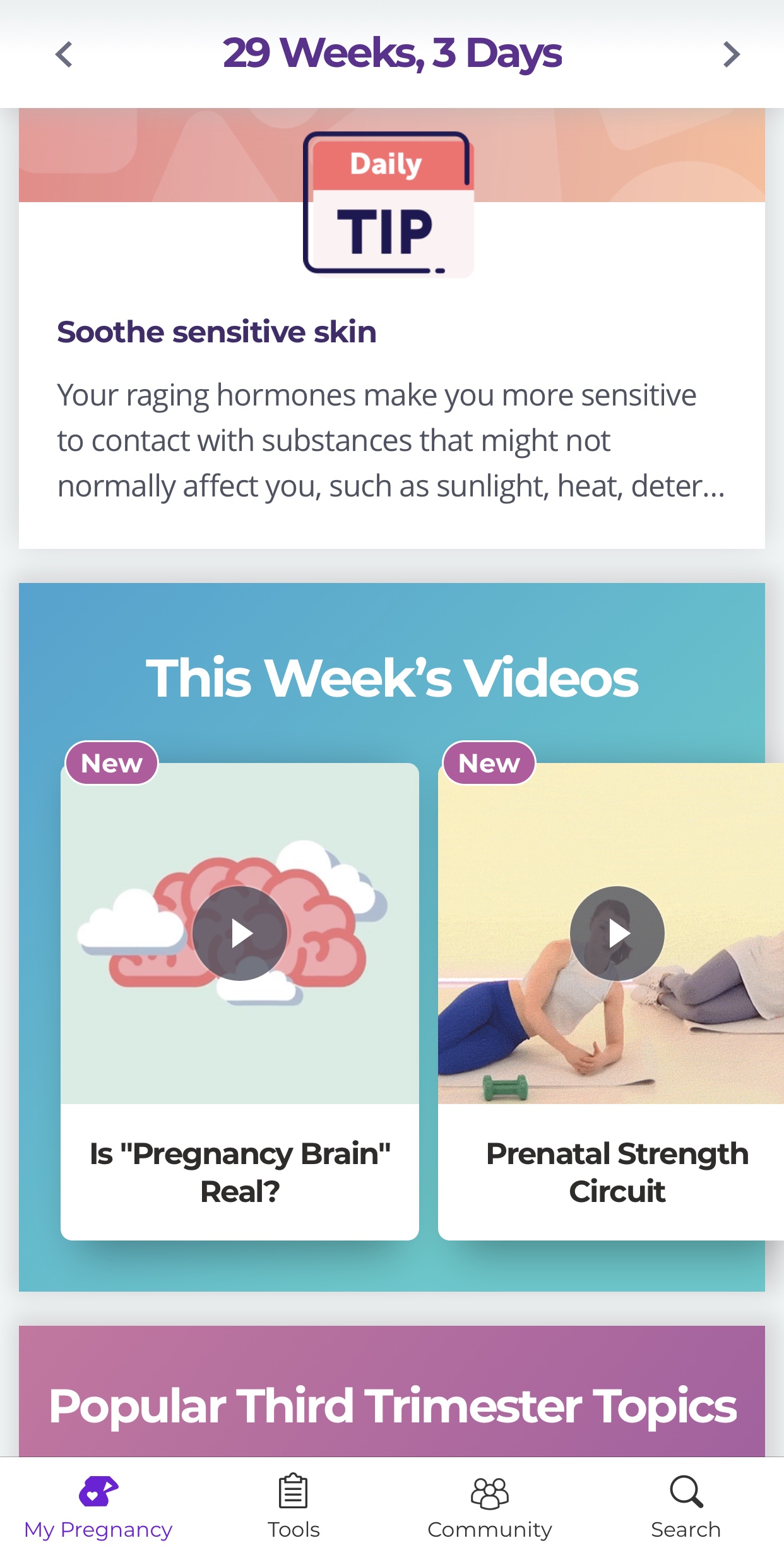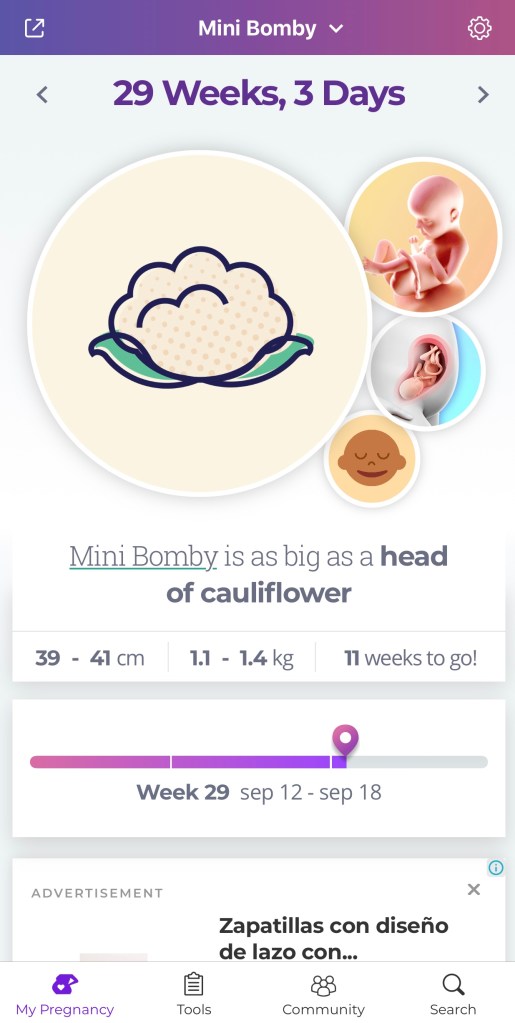 Otra de mis apps favoritas de llama What to expect, esta la descubrí en este embarazo y me gusta que tiene mucho más información, aunque ojo, la app es en inglés, tal vez este sea un obstáculo de que no sea para todos. Te da info como: el tamaño de tu bebé (fruta, props de películas, o juguetes de los 80’s), los cambios que tiene tu bebé semana por semana, los cambios que puedes tener tú cada semana y las novedades de tu bebé de manera muy gráfica y sencilla. También te da tips diarios, incluso un video donde te explica los cambios del bebé cada semana, 5 artículos diarios relacionados con tu embarazo, crianza y bebé, síntomas, y los test médicos que te harán trimestre por trimestre bien explicados. Los foros te llegan a tu correo electrónico y se quieres entrar a uno y escribirte con otras mamás, podrás hacerlo con solo darle clic; por ejemplo ahora se comparte mucha info de como son las consultas médicas, si harán o no baby shower y como son los partos en tiempos de Covid en diferentes partes del mundo.