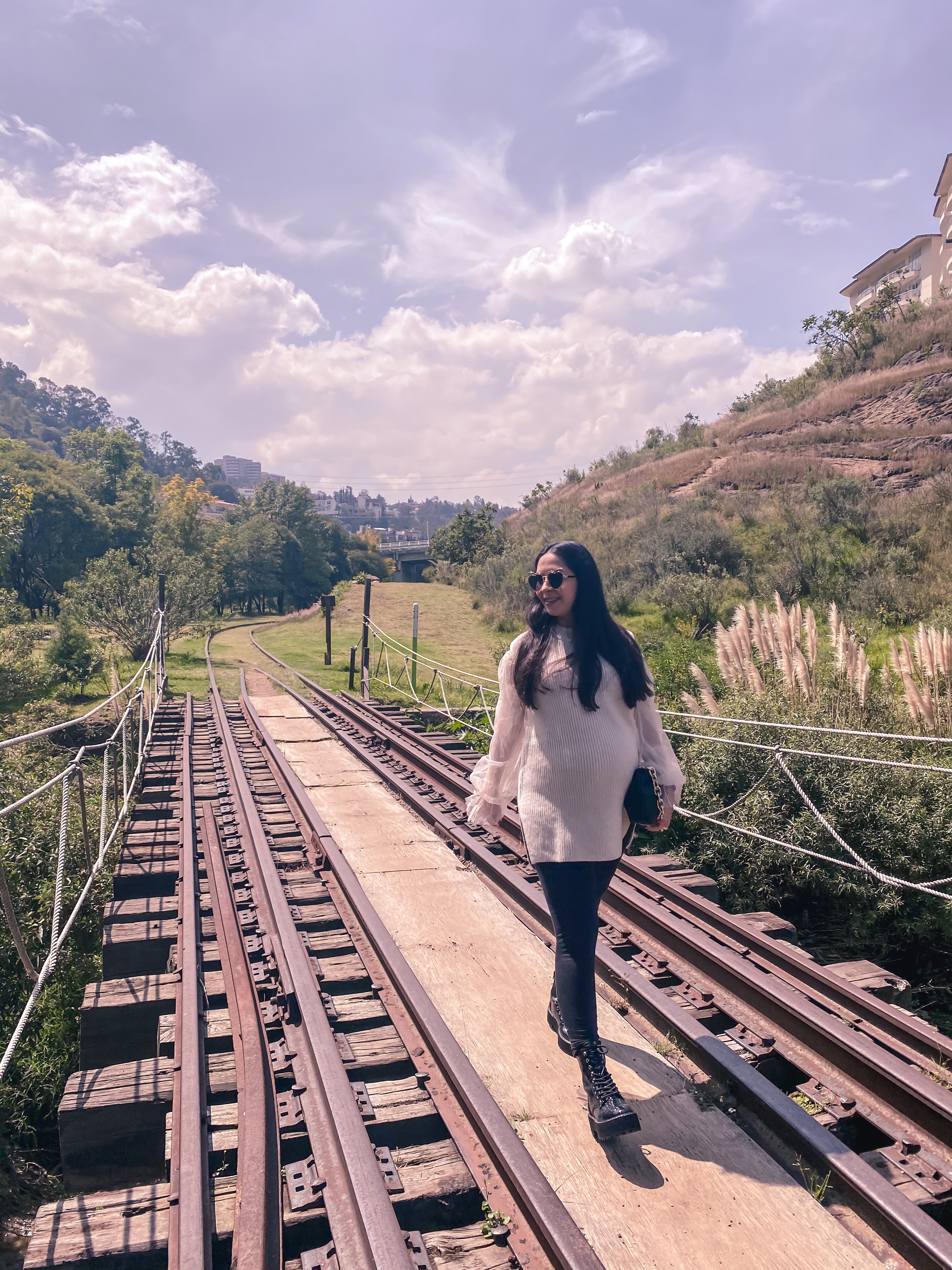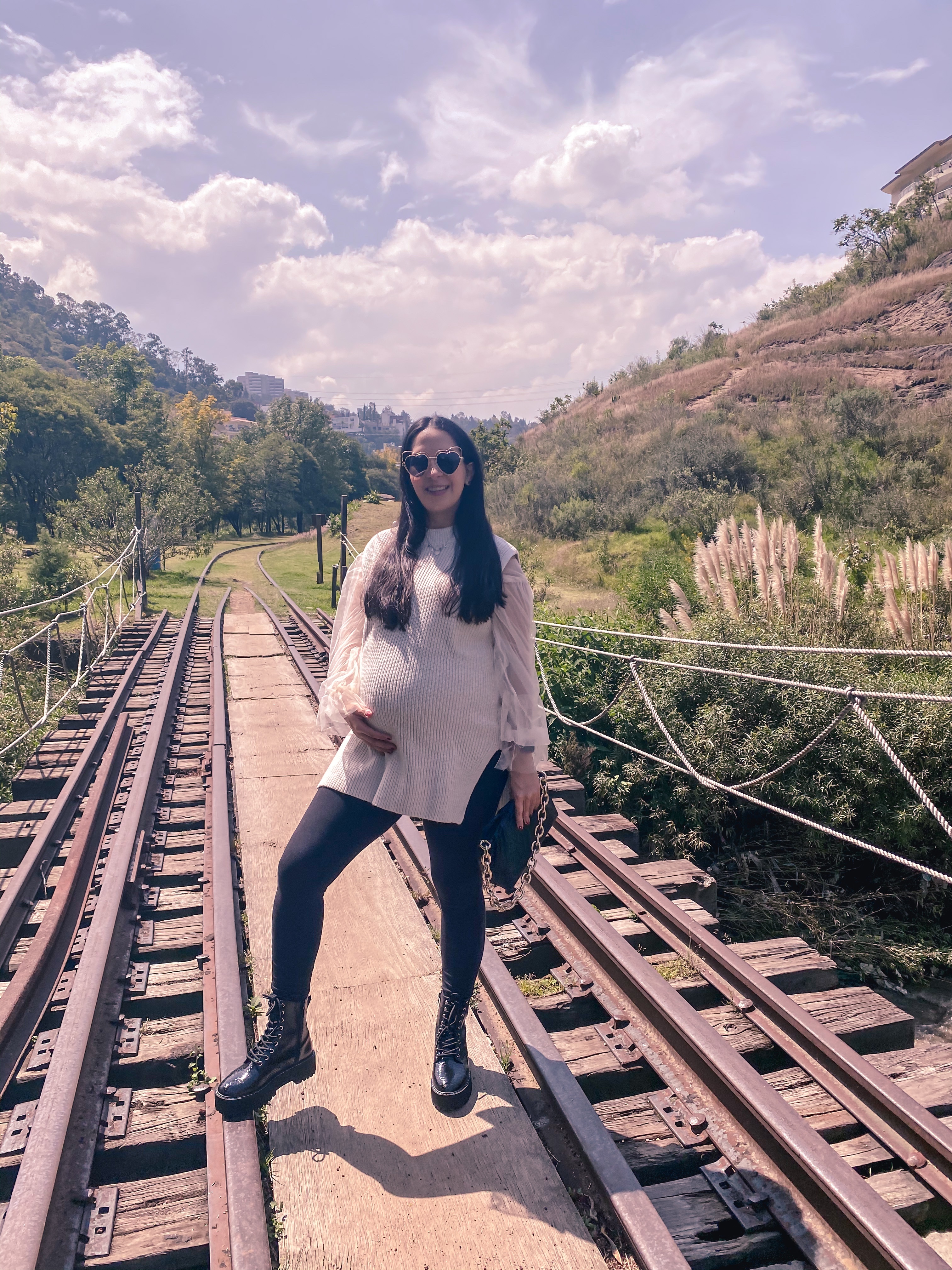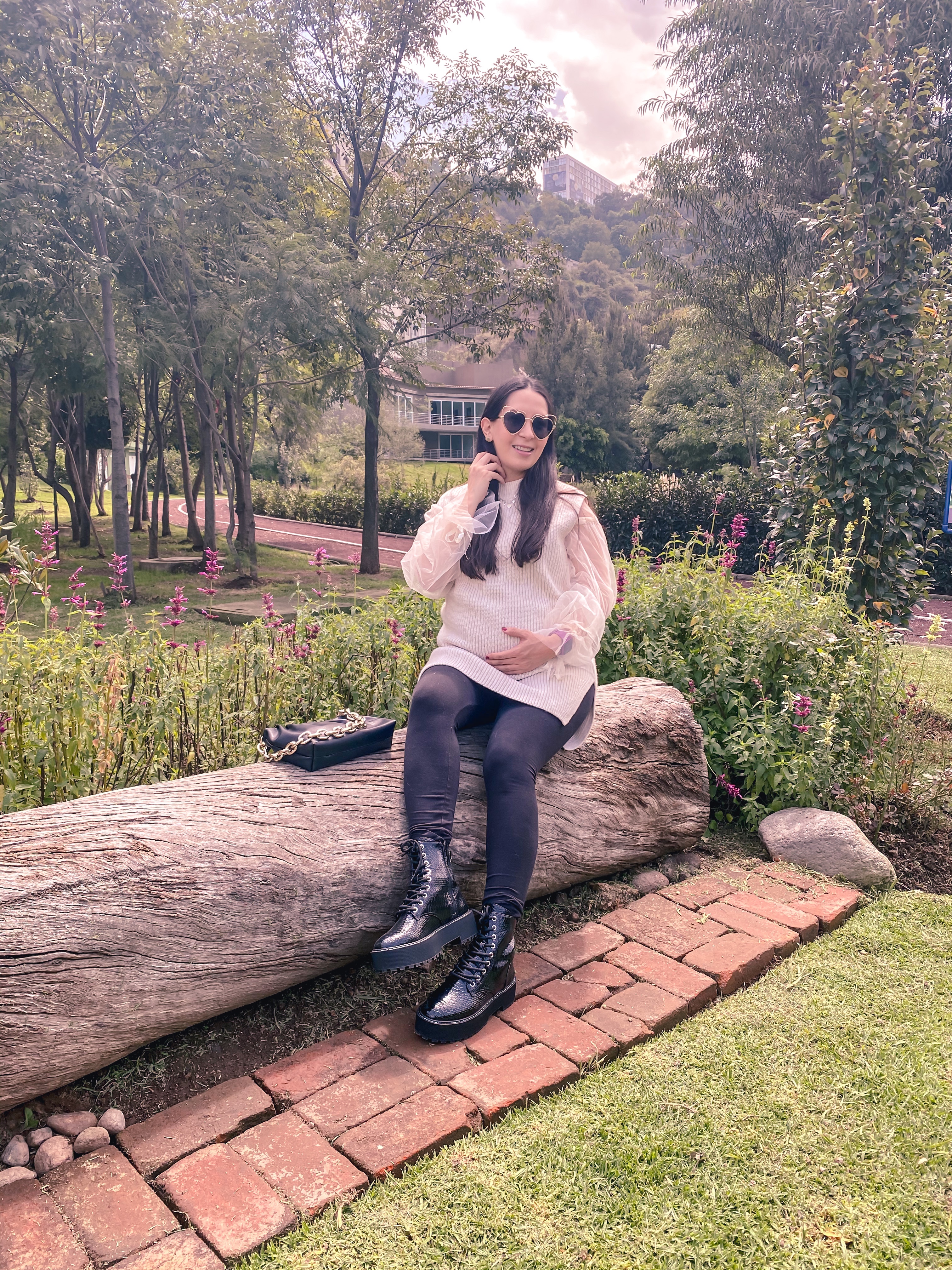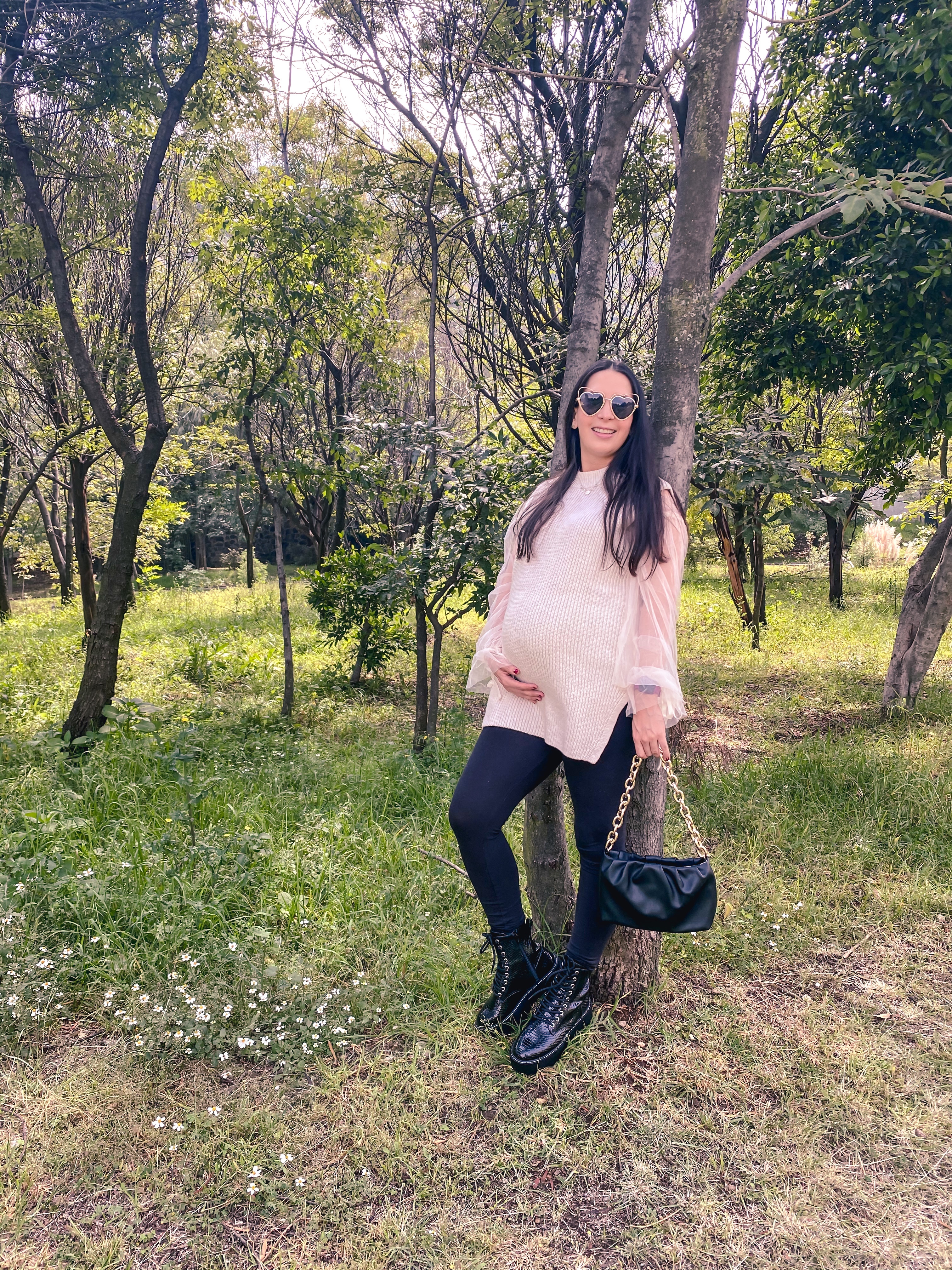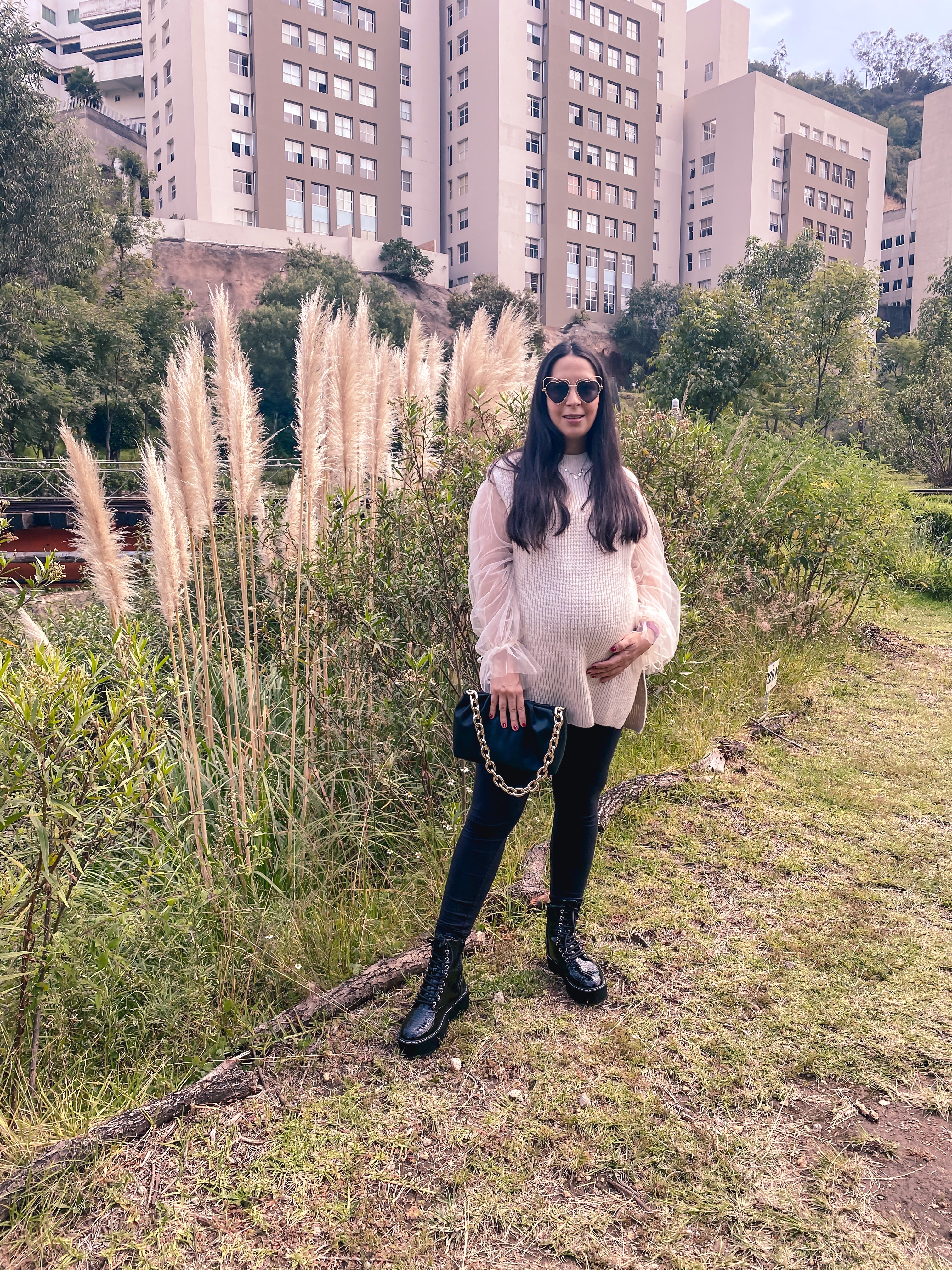 El resto del outfit lo armé pensando en combinar prendas femeninas con un toque más rudo, así que me pusé uno de los pocos pantalones que me siguen quedando a mis 8 meses de embarazo: leggings de embarazo de H&M, un cropped top con mangas hermosas que jamás me pondría solo en estos momentos, pero con el chaleco aplicó súper bien la combinación porque solo se ven las mangas. Y este bolsito que encontré a low cost hace pocos días también y que esta inspirado en un bolso de diseñador y será el bolso más viral, pero ya les contaré el Jueves más de esto.