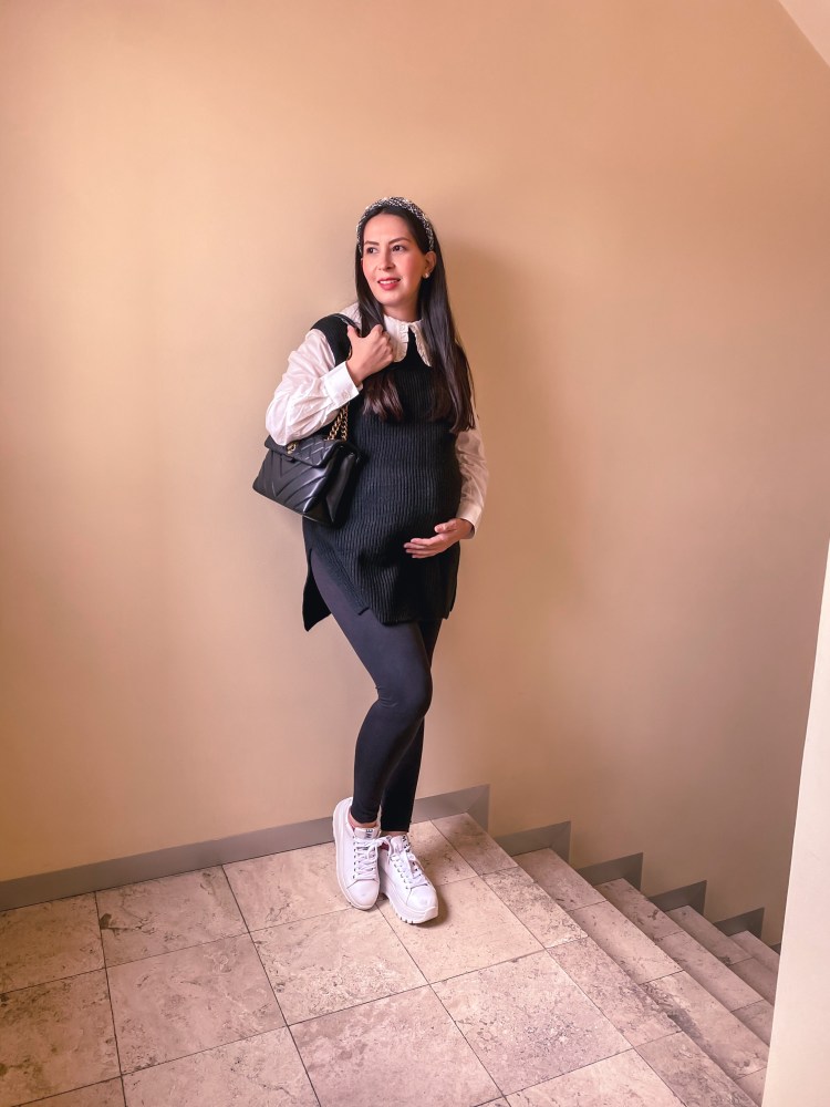 - Leggings de embarazo: son una prenda básica de cualquier guardarropa, puedes usarlos con una blusa linda y un blazer, con un sueter largo en días más fríos, o hasta para hacer ejercicio. Encontré los míos en H&M y Liverpool.