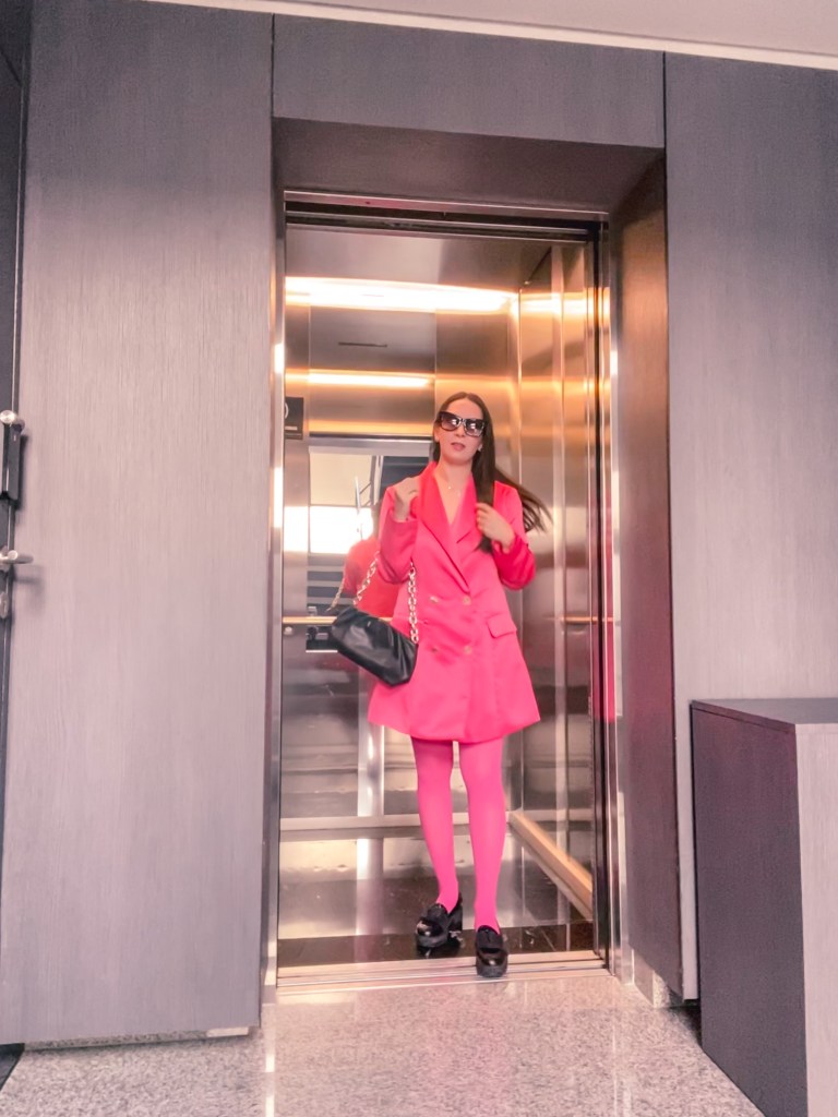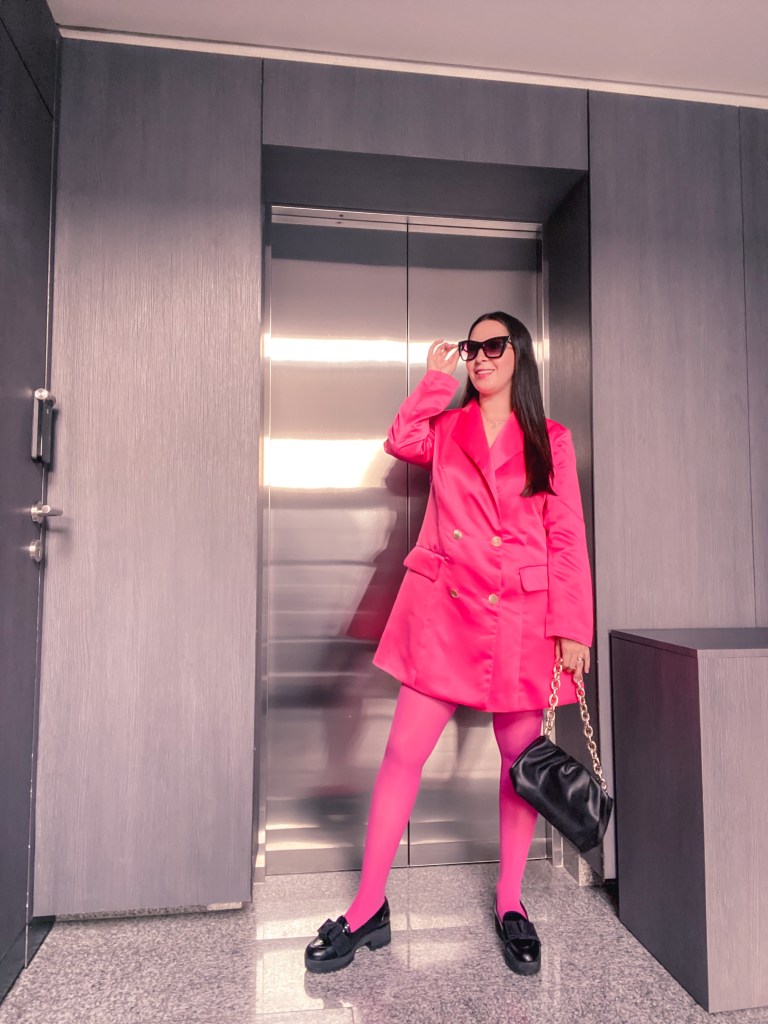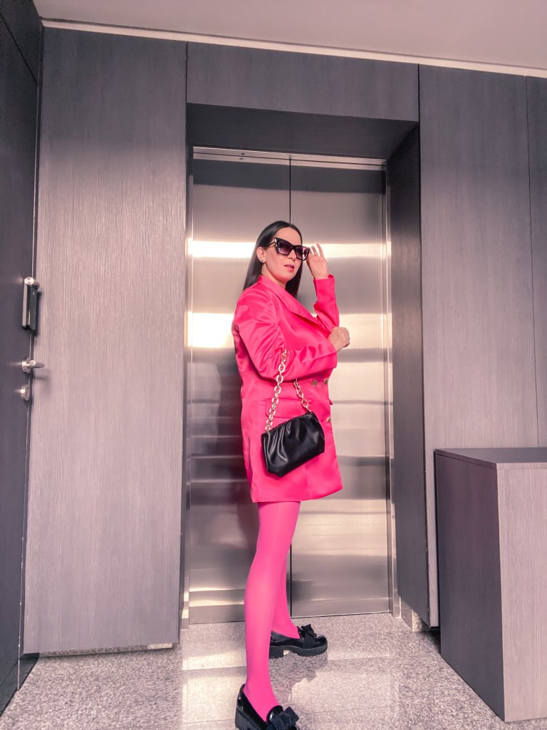 Use mi vestido estilo blazer rosa con botines dotados que encontré en SheIN, te dejo el link aquí, con mis nuevas medias rosas de Zara (que llevaban semanas guardadas en mi cajón), los mocasines negros y bolso negro. Me probé todo junto y voila un look muy chic, elegante a pesar de ser un tono muy brillante y con accesorios que quedaron perfectos. Ame el resultado, de hecho estaba pensando en convertirlo en mi outfit de cumpleaños de este año, tal vez cambiando los zapatos, pero me encanto como se ve todo puesto!.