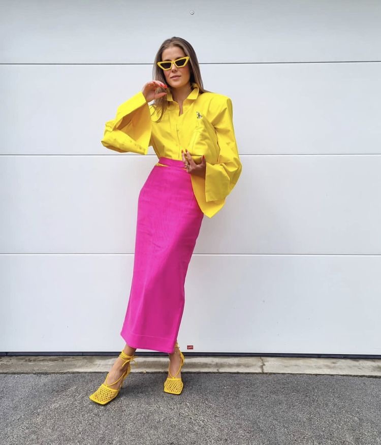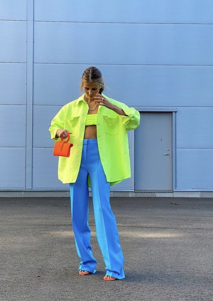 El color block es una de las tendencias que verás mas en 2022, ya que este año esta lleno de colores brillantes. Y se trata de combinar en un mismo outfit 2 o hasta 3 o mas colores saturados, que seguramente en otra temporada jamás te hubieras atrevido a usar juntos.