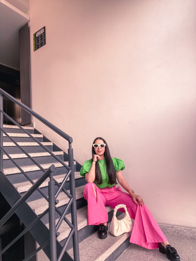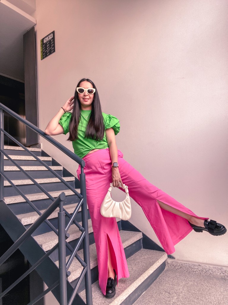 En esta ocasión combine esta tshirt verde con mangas abombadas que encontré en Zara en las rebajas con mi pantalón rosa nuevo con corte wide leg y una tela súper ligera de SheIN. Cómo tienen la abertura al frente, me puse mis mocasines chunky.